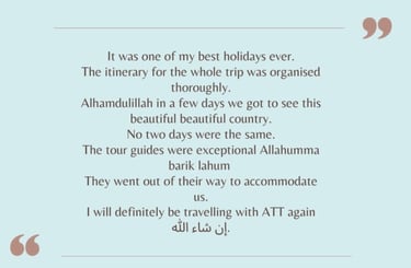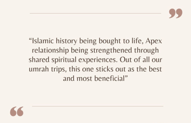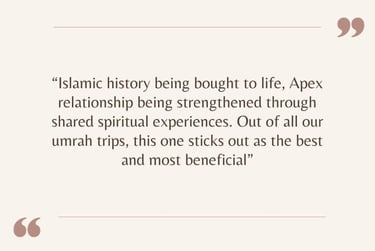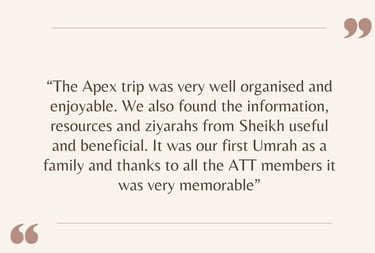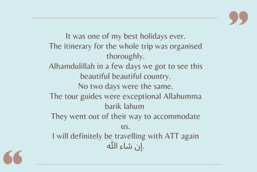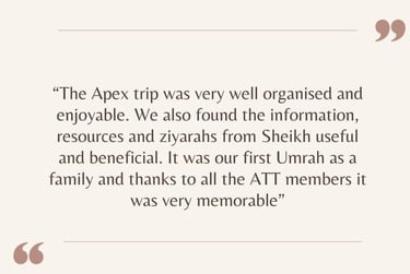 Apex Tarbiyah Trips is not a travel agency but works with selected partners to provide the logistics of our trips. We aim to enhance these trips with our unique tarbiyah programmes and activities. From spiritually uplifting reminders to historic excursions, and family activities – there is something for every participant! Our itineraries are hand-selected and balanced in order to nurture mind, soul, and body.